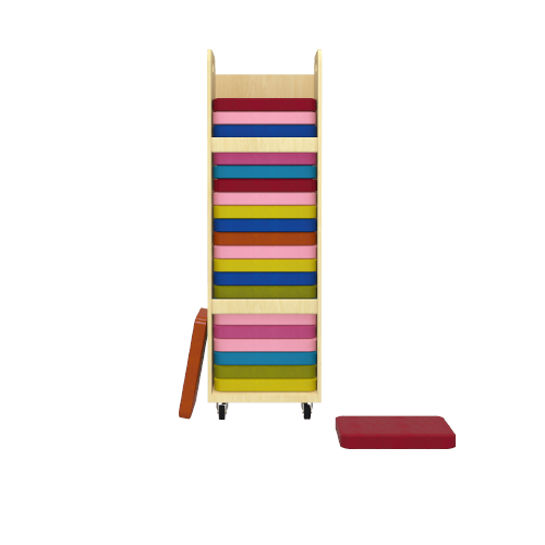 Vertical trolley with layered compartments resembling a “sandwich” layout for books, files, or learning materials.